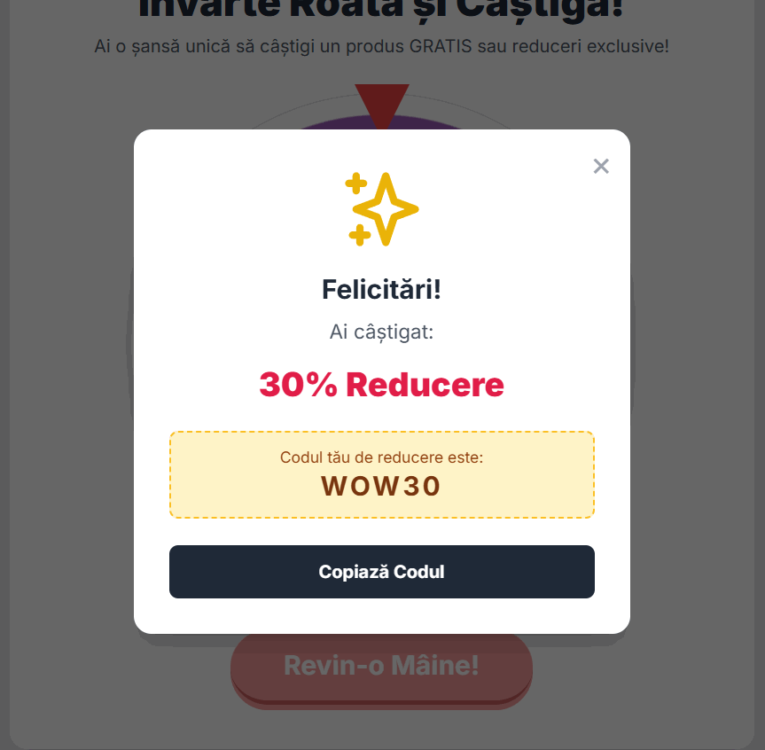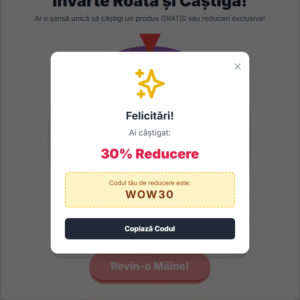 Mi-a plăcut în mod special faptul că poți seta o limită zilnică la o singură învârtire, ceea ce îi face pe oameni să revină. Îl recomand 100% tuturor magazinelor online care vor mai mult engagement și vânzări. 🔥